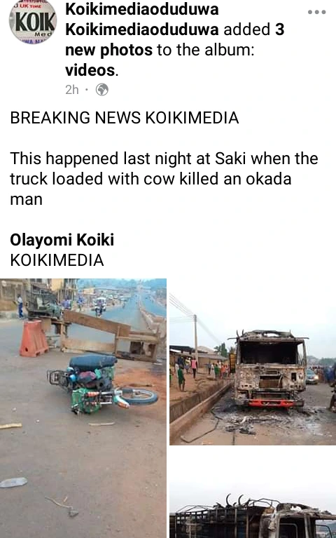 The reprisal attack on the Vehicle and burning it alongside the cows was as a result of an accident involving the truck and a Yoruba man known as Ayuba Raji who was riding on his Motorcycle commonly known as "Okada". The accident claimed the life of the victim.